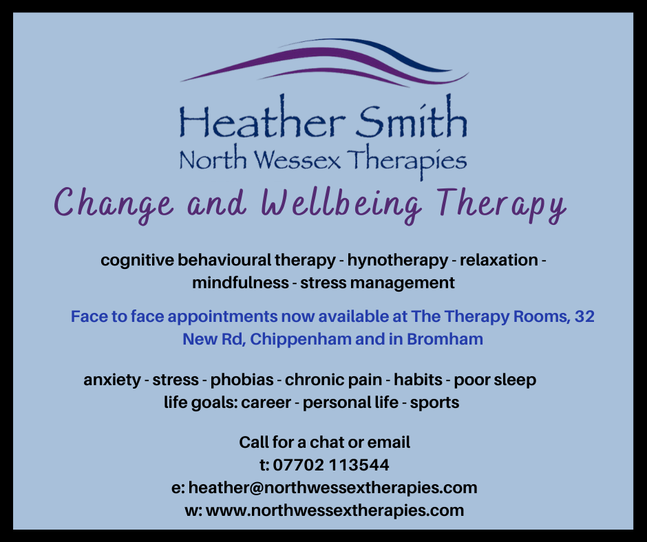 Heather Smith is taking new face to face clients at the Therapy Rooms, which are co-located with the Hathaway GP service’s central Chippenham surgery in New Rd. If you prefer, online sessions are also available using a secure system designed for medical consultations. It is easy to use, with no installation needed.