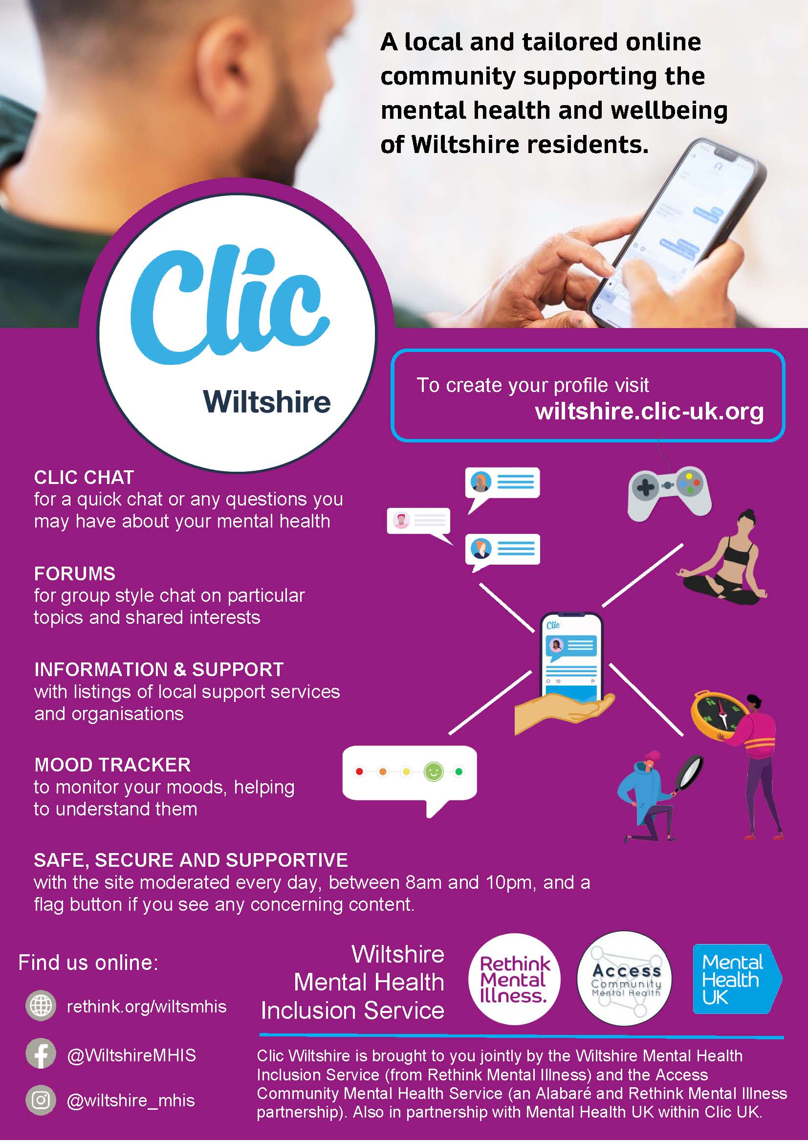 The Clic online community is for residents of Wiltshire, helping you access mental health support online and connect with others in your community for conversation, peer support, information and advice ……. all for support with your wellbeing.