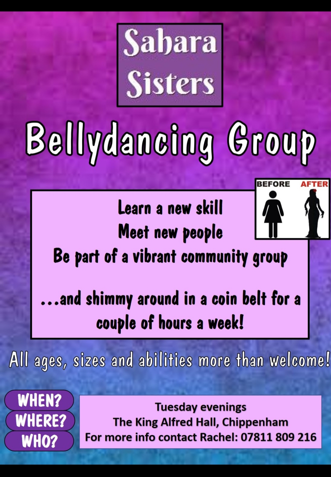 We are a community dance group, based in Chippenham. We enjoy all forms and styles of bellydance, and have built up quite a repertoire of routines over the years; some taught to us by experienced bellydance instructors, and others choreographed by members of our group. We also occasionally branch out into other dance genres, and have some particularly beautiful Bollywood, Hula and Samba routines too!